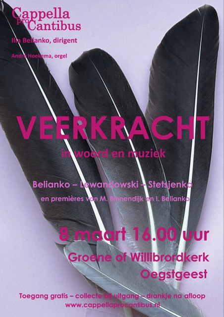 Kamerkoor Cappella pro Cantibus, onder leiding van Ilia Belianko, verzorgt een muziekmiddag met levensverhalen over veerkracht, het thema van het Groene Boekje van dit jaar. In ons leven hebben we helaas met tegenslagen te maken, maar gelukkig beschikken we vaak over veerkracht om er mee om te gaan. Deze middag horen we een aantal voorbeelden van levensverhalen van mensen uit diverse landen in de vorm van zelfgeschreven proza en poëzie. Antalolii Rykberh zal het Oekraïnse gedicht Schredyk voorlezen, een gedicht over een kleine zwaluw die rijkdom en vruchtbaarheid voorspelt. Cappella pro Cantibus omlijst dit met liederen van zeer verschillende herkomst. Uit de byzantijnse traditie klinken er Oekraïense liederen van Stetsenko en uit de synagoge psalmen van Lewandowski. Onze eigen kerkmuziek is vertegenwoordigd met liederen op tekst van Huub Oosterhuis en Michele Najlis. Cappella laat ook muziek uit eigen kring horen: een première van het motet Ubi Caritas van koorlid Mart Binnendijk en twee composities van dirigent Ilia Belianko. De gezongen teksten getuigen van de bronnen waaruit mensen hun veerkracht putten.